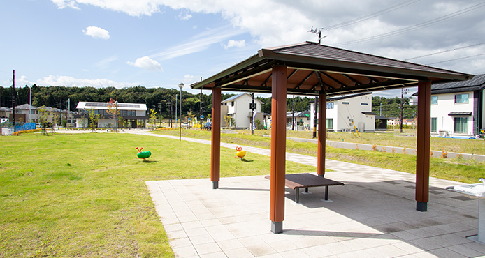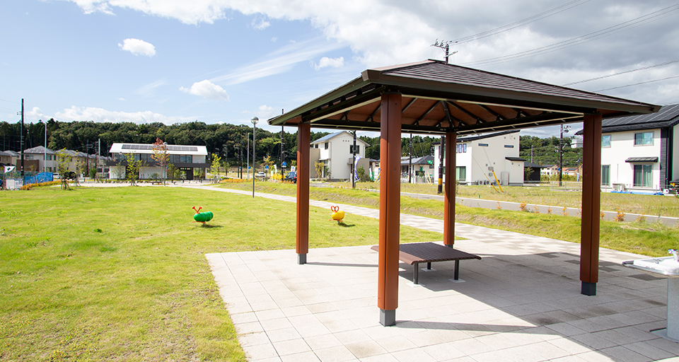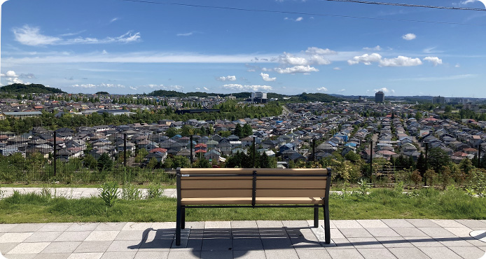 街の中央にある公園は、広さ約9,000㎡(南北約30m×東西約300m)。公園東側はフラットな芝生広場で、東端にある見晴らしの丘に設置したベンチは、泉パークタウンの眺望を楽しみながら憩える空間となっています。公園西側は、子供向け遊具だけでなく、大人も利用可能な健康遊具を設置し、世代を問わず楽しめる空間となっています。
